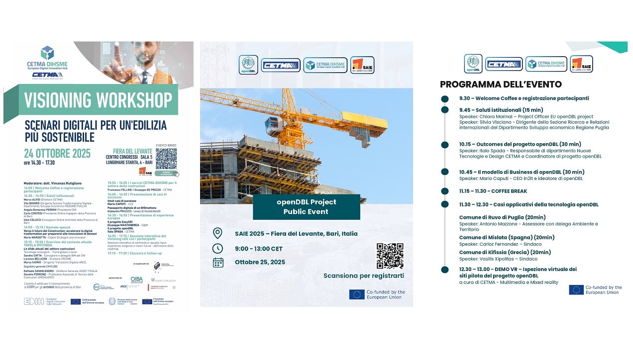 Due appuntamenti, un unico obiettivo: accompagnare il settore delle costruzioni nella transizione digitale e sostenibile. In occasione del SAIE 2025, che si terrà alla Fiera del Levante di Bari dal 23 al 25 ottobre, CETMA – Centro di Ricerca e Innovazione Tecnologica – organizza, anche attraverso l’hub digitale CETMA-DIHSME, due momenti aperti a professionisti, imprese e pubbliche amministrazioni.